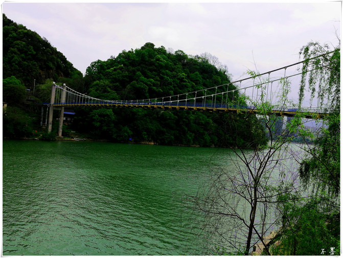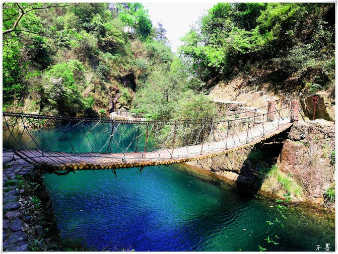 El agua en el cañón no es mucha, el azul puro, el puente de cable, el camino está lleno de diversión salvaje.