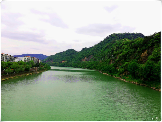A lo largo del río es un camino verde, árboles profundos. El agua verde del río, las montañas verdes del otro lado gotean, las casas del pueblo están dispersas.