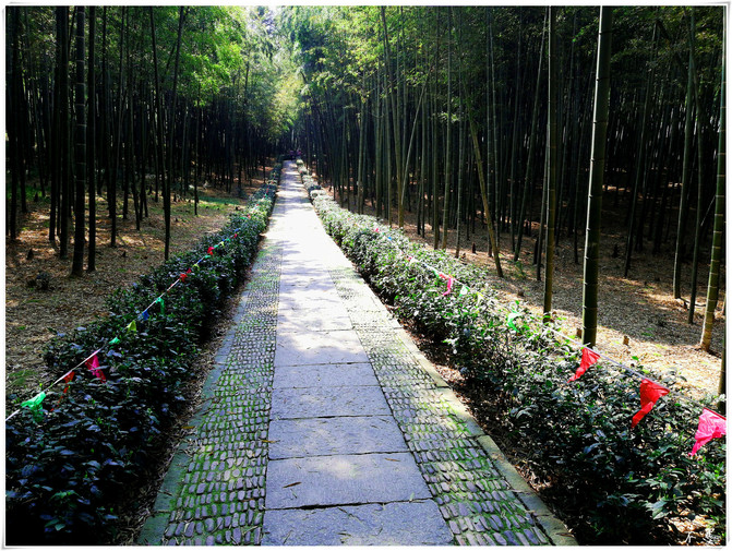 El camino del bosque de bambú es largo y profundo, y el denso bosque de bambú cubre el cielo.