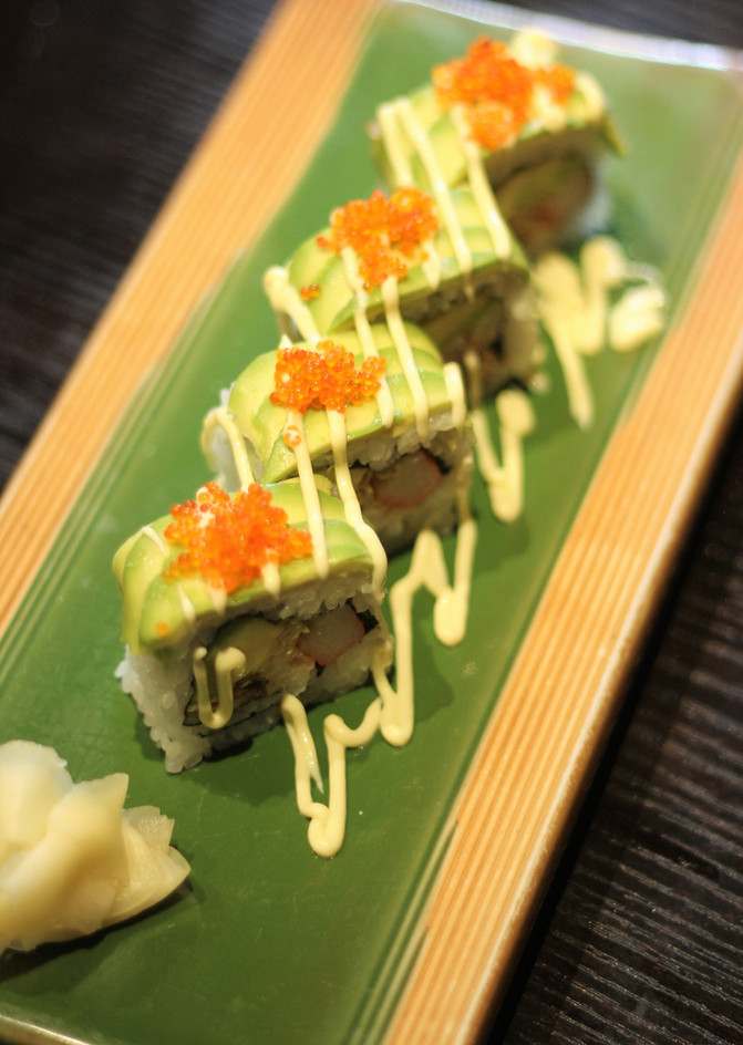 La masa de arroz está firmemente envuelta en huevos, barras de cangrejo y pepino.