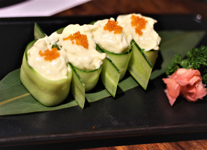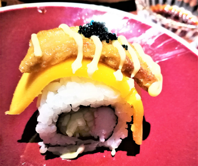 Me encanta este sushi, una capa gruesa de durian de alta calidad, envuelta con una delgada lámina amarilla muy precisa, adornada con semillas de pescado amarillas,