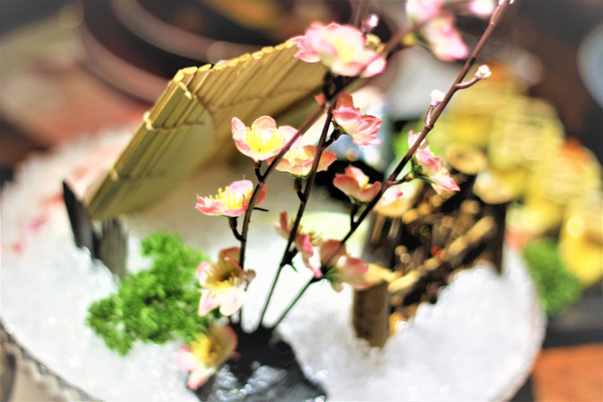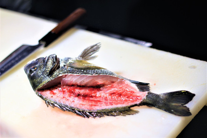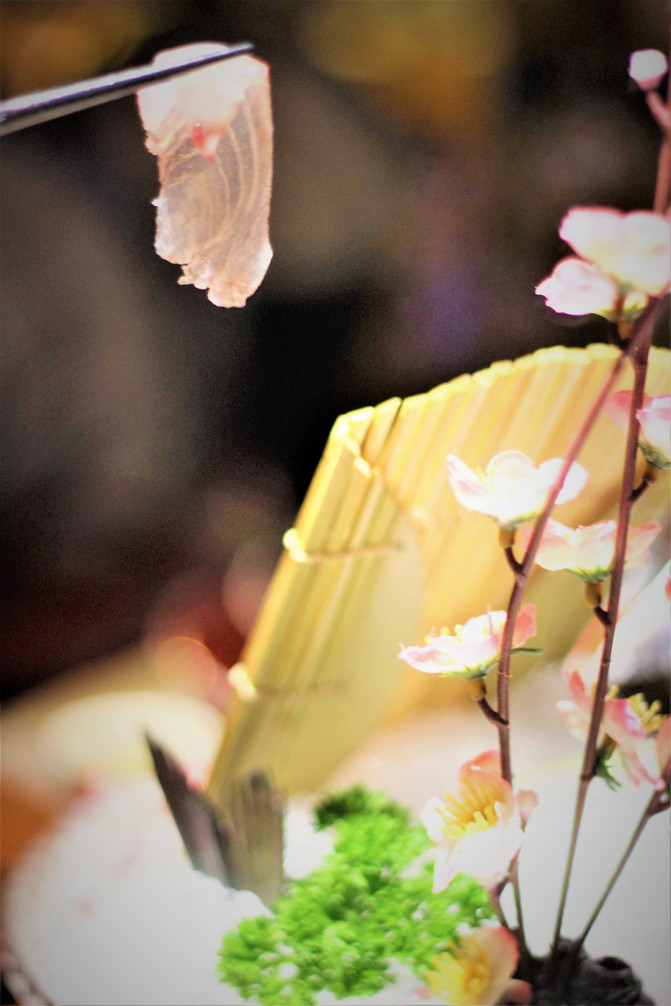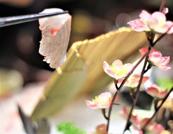 ¡El pescado es el primero en comer, es perfecto! Los asistentes fueron testigos de la excelente mano de cuchillos del chef, el sashimi de pez de garra con alas de cigarra verdaderas y huesos de pez con cabeza de pez decorados con placas.