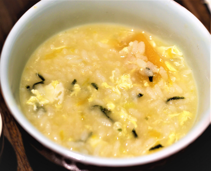 Después de pescar las verduras en la sopa de pescado, agregue el arroz, la púrpura molida, deje que el lado posterior vertiera los huevos mientras se mezcla, deje que el arroz en la sopa pueda