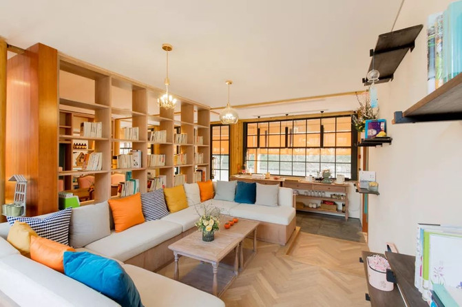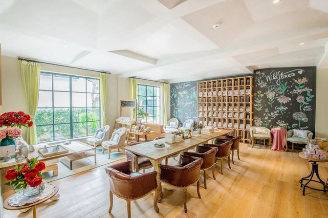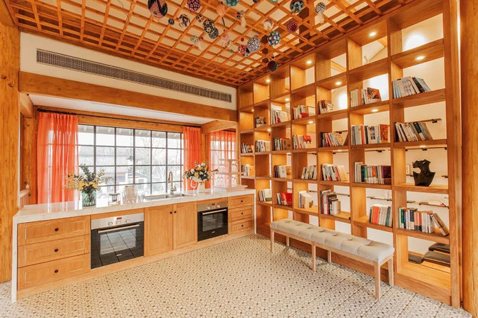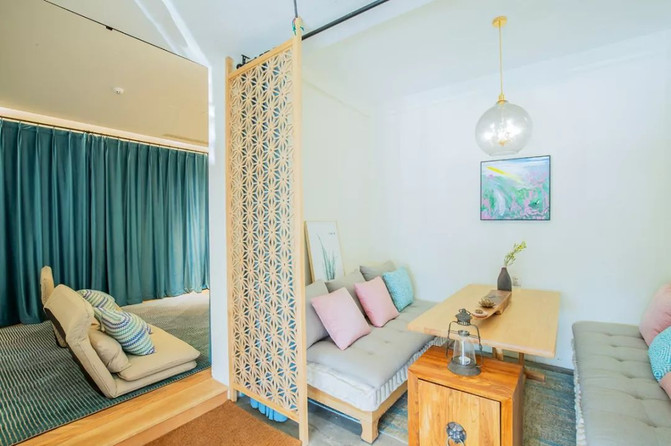 Las baldosas de la mesa en la casa están especialmente hechas a medida, con patrones frescos, hervidoras, agua mineral, café colgante, tazas de café, tazas de té y teteras. El aceite esencial de L'OCCITANE hace que toda la habitación emita un ligero aroma.