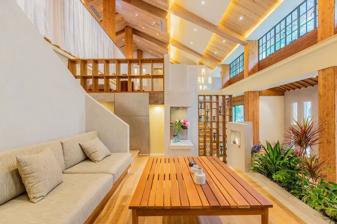 La habitación emite el olor a troncos, con mesas y sillas de troncos, tatamis, iluminación de tonos cálidos, mesa de té, flores, cálida sensación.