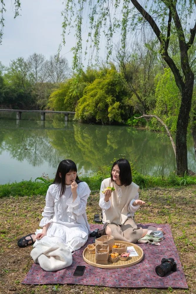 En el día de nubes blancas volando y mosaicos, traiga una cesta de desayuno y almuerzo, busque una flor favorita de un árbol, arrastrando a un compañero o sentándose solo, ven a un picnic bajo el árbol de flores, sienta el interés de la antigua gente en el paisaje y el agua suave y sinuosa, todos juntos para un picnic, juegos, con esta es una hermosa imagen de diez millas de primavera.