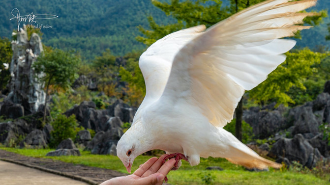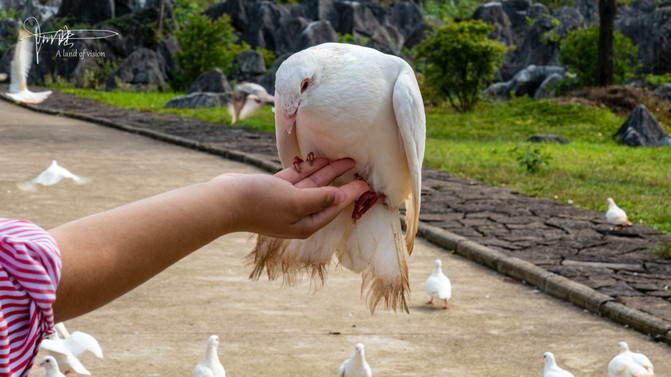 Estuvimos esperando unos minutos aquí y fuimos testigos de uno. A la sugerencia del personal del lugar escénico, también alimentó a mano, experimentó la sensación de que la paloma se quedó en la palma de la mano.
