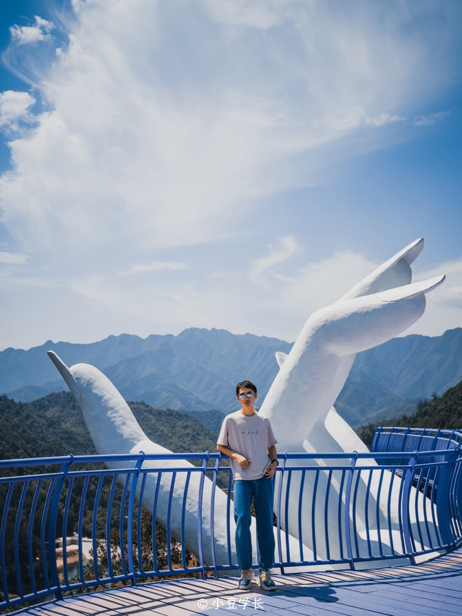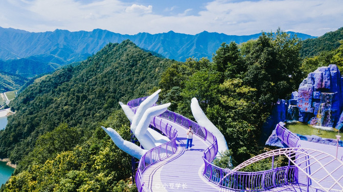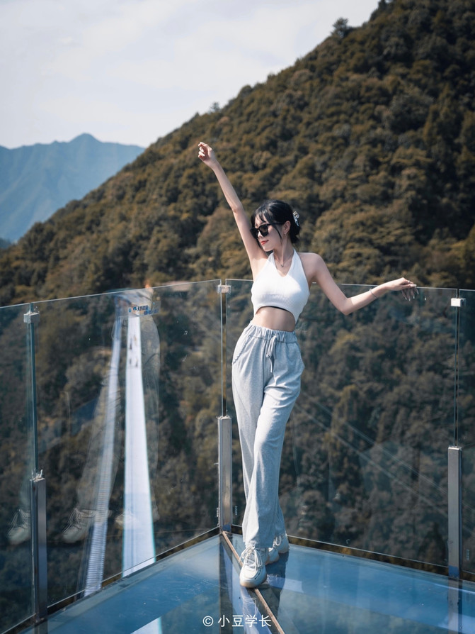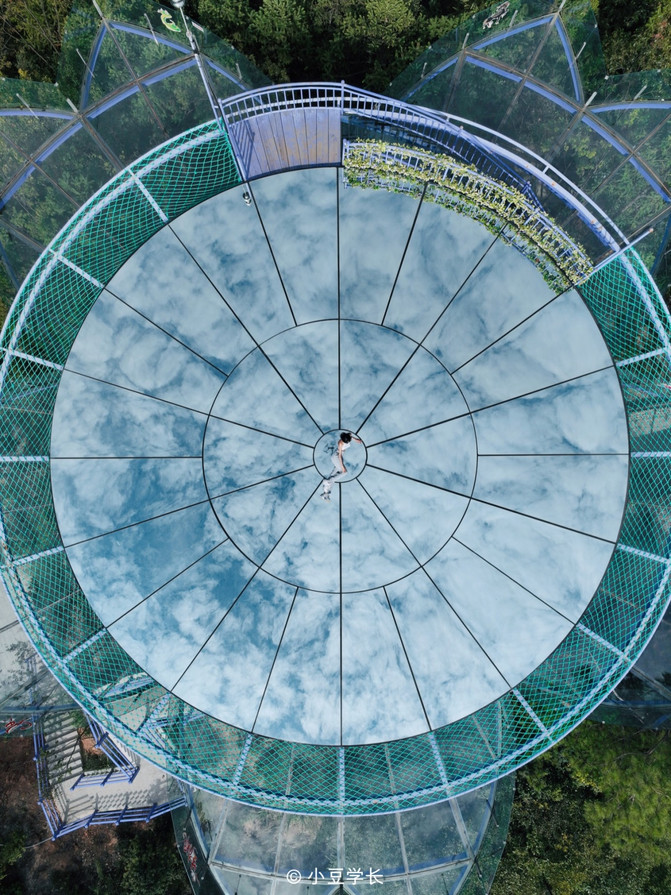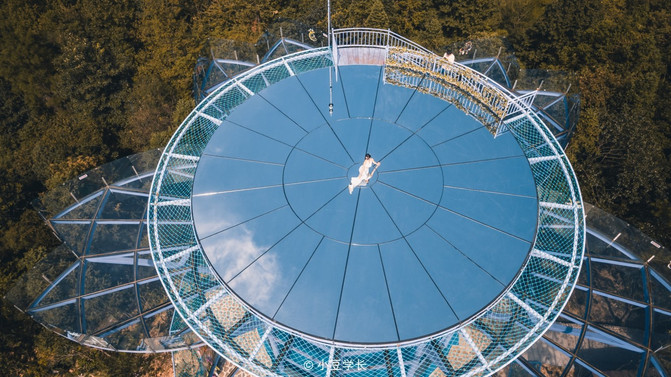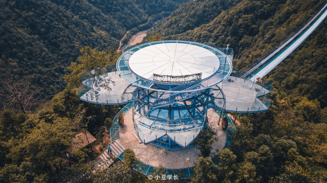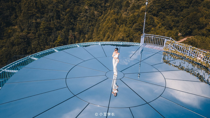 Entre las montañas y los bosques, la plataforma de observación del acantilado floreciente, toda la estructura está hecha de estructura de vidrio y acero, que es particularmente hermosa a la distancia. El segundo piso es una plataforma de observación de vidrio, caminando por encima es emocionante, y el tercer piso es un espejo del cielo. El cielo y el paisaje de la montaña se reflejan en el vidrio debajo de los pies, y el dron se utiliza para encontrar el ángulo adecuado.