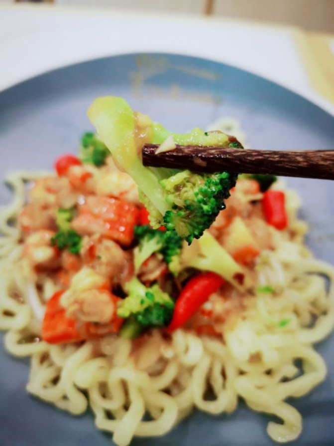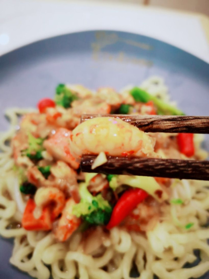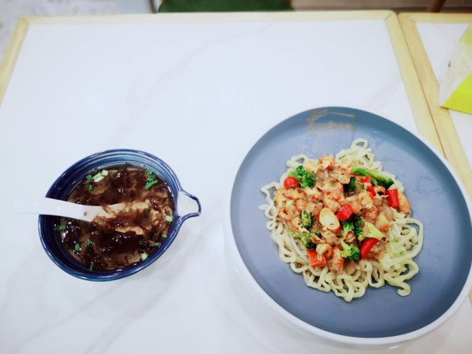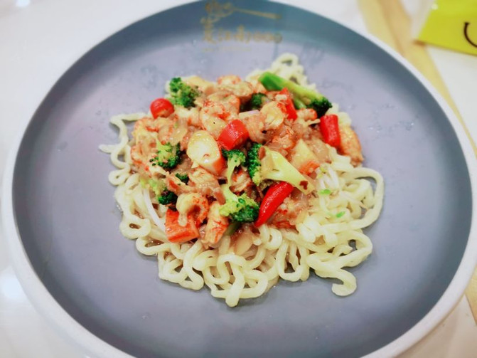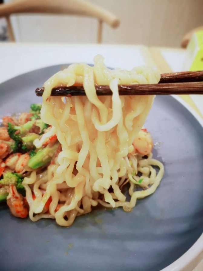 Brócoli verde, carne de langosta roja, fideos hechos a mano.La carne de langosta es muy firme y fresca, la línea de camarón está limpia y limpia, la carne es rica y gruesa y deliciosa.