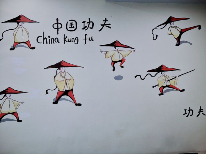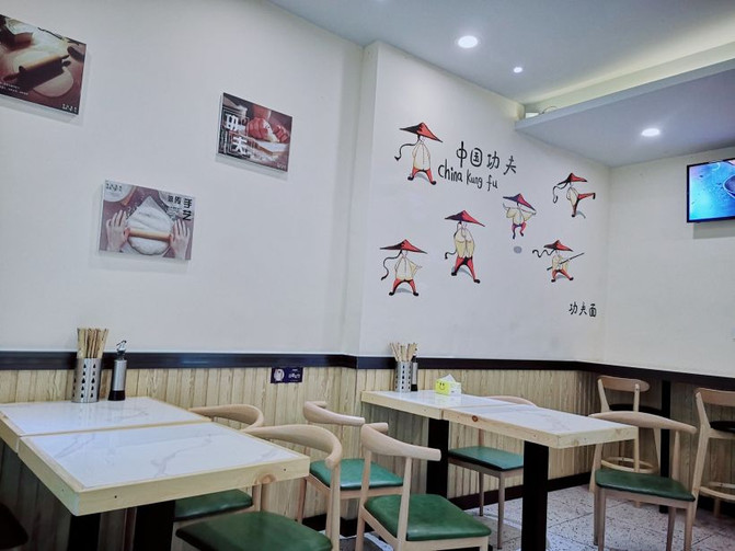 La decoración de la tienda recién abierta también está limpia y ordenada. Algunas imágenes publicitarias en la pared, así como algunas versiones pintadas de los villanos de kung fu, kung fu chino.