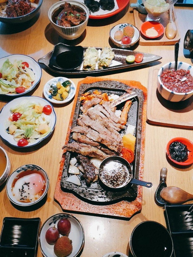 Ensalada de cortesía, sopa deliciosa, fruta de temporada, sandía y uvas, buena calidad y bastante dulce