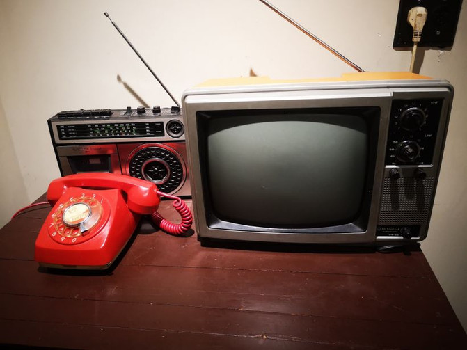 La decoración más sencilla, bancos, muebles de madera, luego grabadoras de audio antiguas de tipo tarjeta,