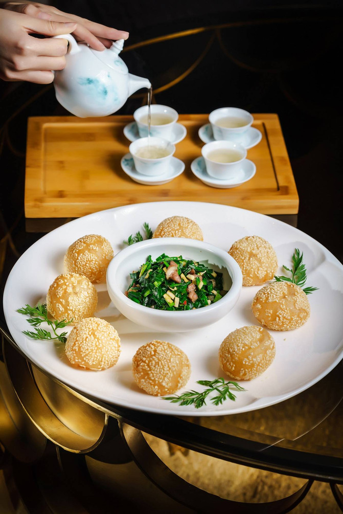 Spring leopard frito con bola de cáñamo con té Longjing