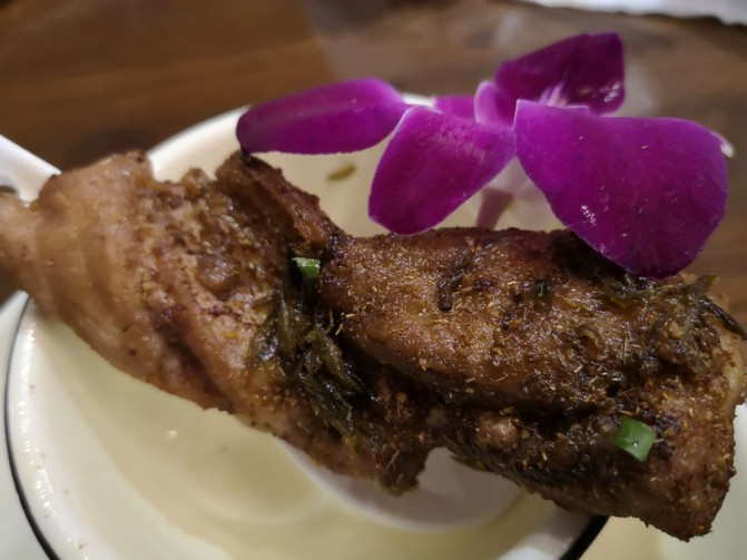 es suave y delicioso, la salsa está bien sumergida, la piel de pollo es crujiente y deliciosa,