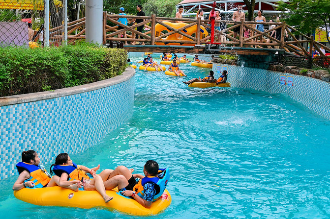Jugar cansado, puede ir a la burbuja del río perezoso, descansar perezosamente en el anillo flotante, a lo largo de la corriente, nadar relajado en el río flotante rodeado de árboles antiguos, o sumergirse en el agua para un aturdimiento fresco, o caluroso y caliente y amigos a su alrededor jugar, cómo es bueno.
