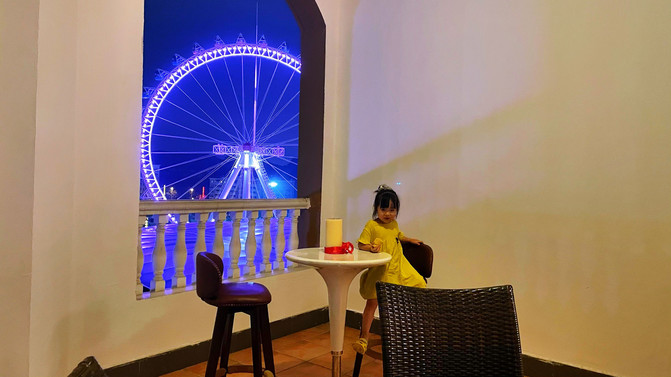 También hay una terraza de un área no pequeña fuera de la habitación, una mesa al aire libre con cuatro sillas, además de un bar con 2 taburetes de bar, la ventana de la terraza puede ver la rueda gigante de Hangzhou Paradise. Mirando durante el día todavía no siento nada especial, cuando las luces de la noche se encienden, la concepción artística se eleva, la niña dijo varias veces, ¡qué hermoso!
