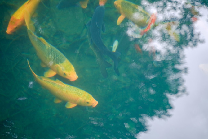 El agua del estanque es clara y clara, y la carpa se aleja.
