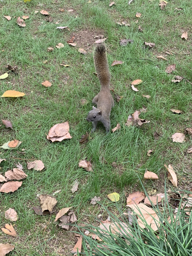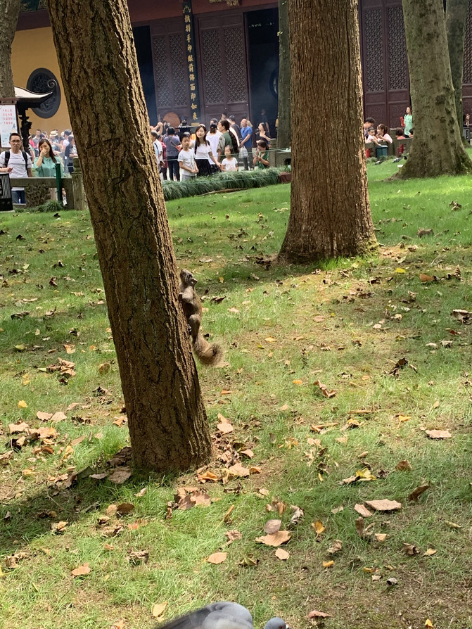 Las ardillas y las palomas en el templo Lingyin viven en paz.