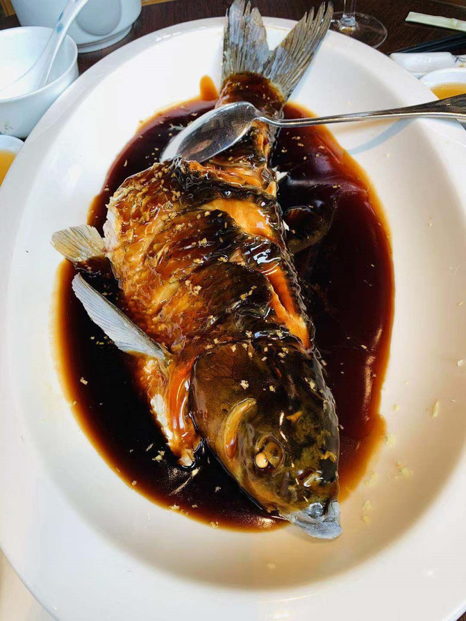 Justo para ir a la famosa sala de huéspedes de estado de Hangzhou para almorzar. Ya está cerca, en realidad todavía necesita esperar 14 mesas delante. Pidió el famoso pez vinagre del lago oeste. Arroz de hongos de pincha de primavera de tigre, jaula de camarón, sopa de arroz.