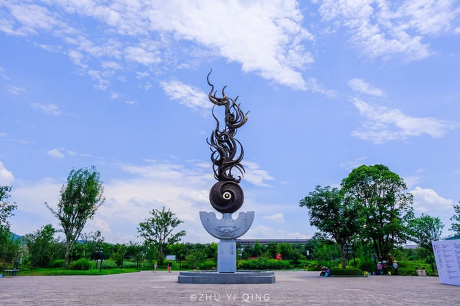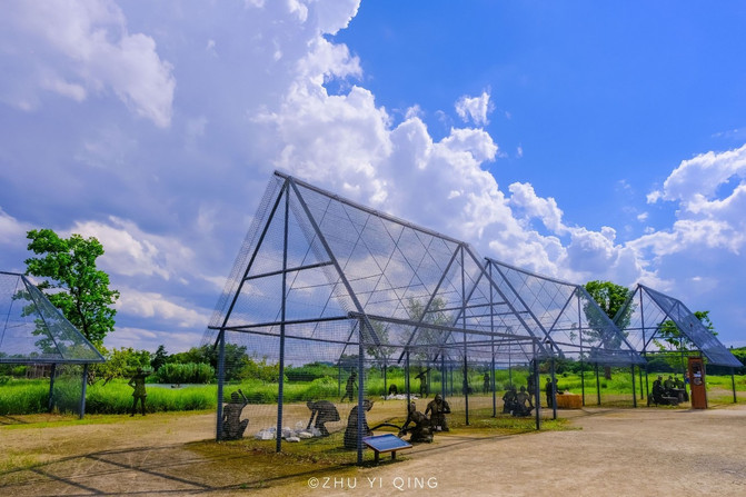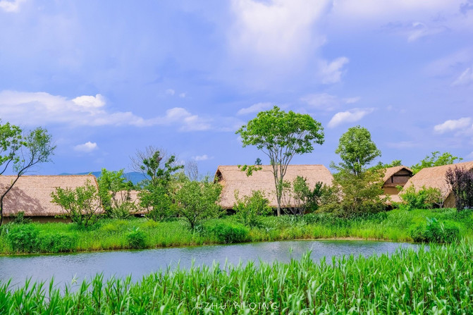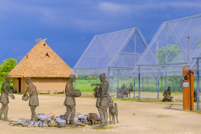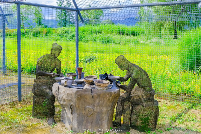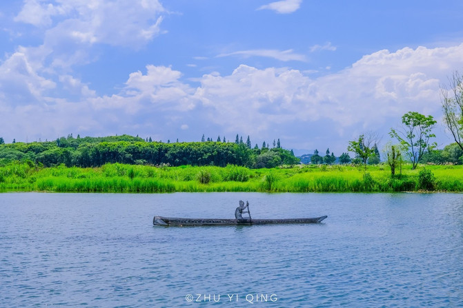 También hay una escultura de la gente de Liangzhu remando en el río. El cielo azul y las nubes blancas en la distancia y el agua del lago de pastizales cercanos me llevaron de vuelta a esa época.