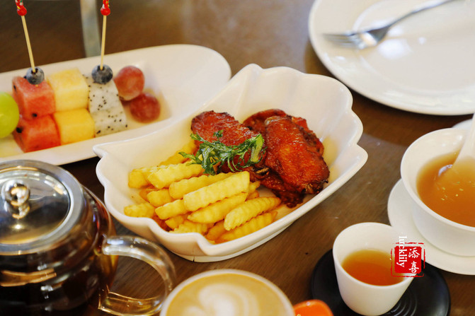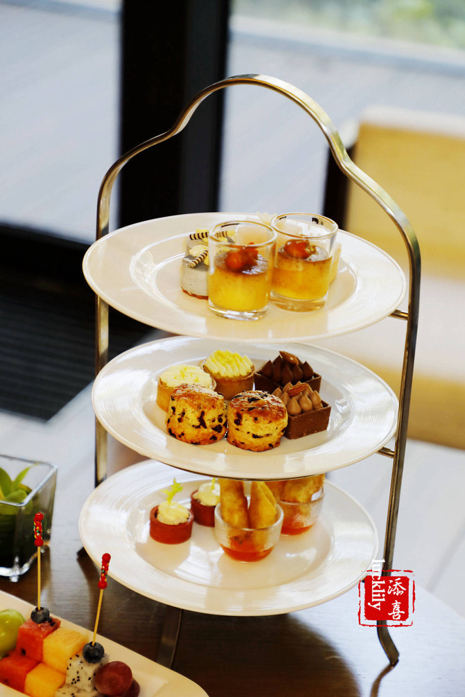 El estante de tres capas consiste en torre de atún, rollos de camarón fresco de mariscos árticos, Si Kang, limon Fischernan, pastel de leche de soja de sésamo negro, rollos de jade blanco, torre de avellanas de chocolate, huevos guisados de calabaza, así como alas de pollo asadas de Orleans y papas fritas y plato de frutas para niños.