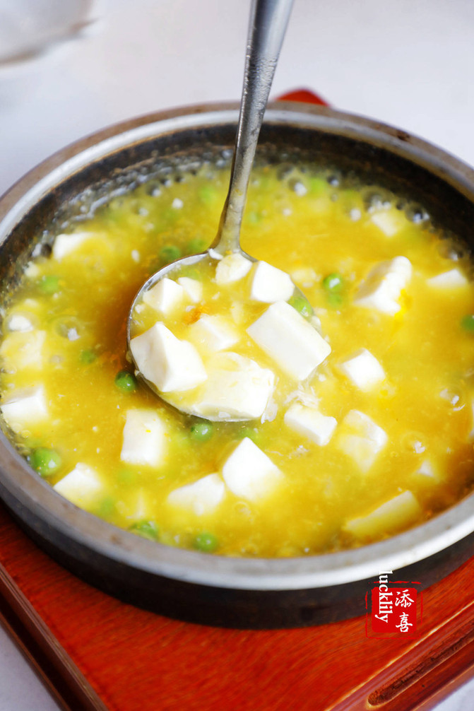 El tofu en polvo de caldo de piedra está lleno de ingredientes. Cuando se sirve, el tofu en la olla de piedra ha estado burbujeando. Este tofu también debe comerse mientras está caliente. La sopa es suave y suave.