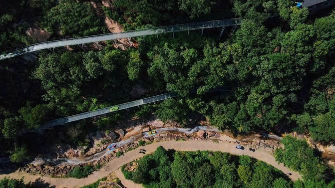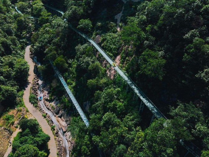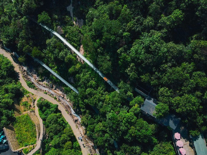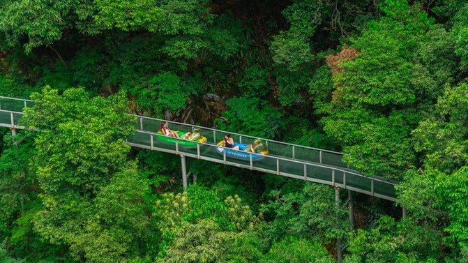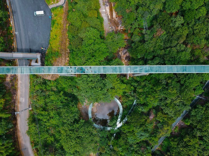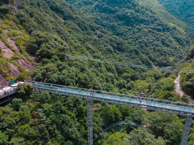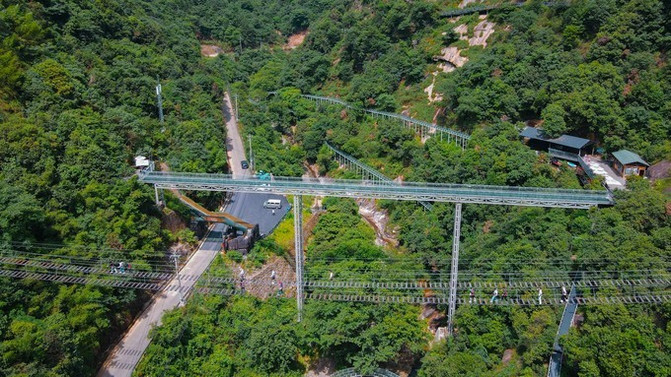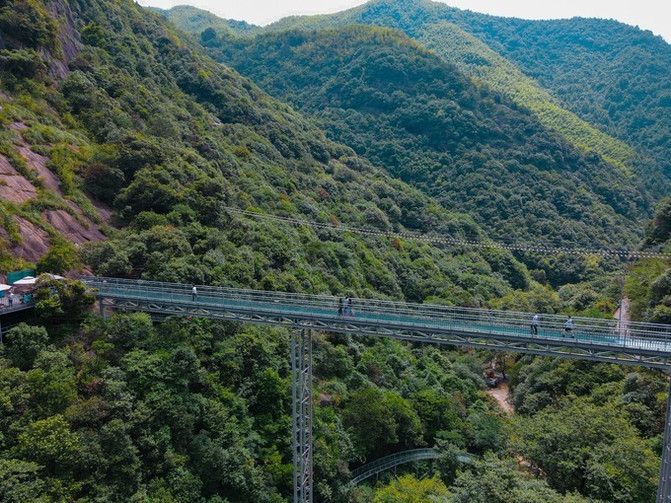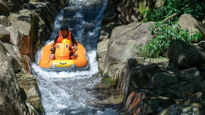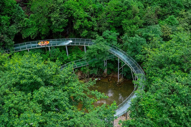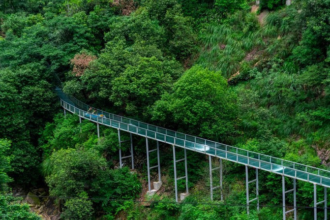 Cuando llegue al otro lado del valle, puede jugar al rafting de vidrio en línea. El paseo de vidrio tiene una longitud total de 1280 metros y una caída de 88 metros. Es el primer tobogan de agua de vidrio en Hangzhou.