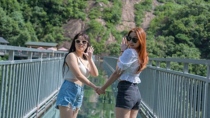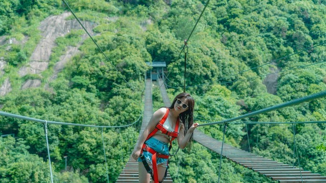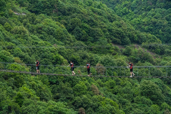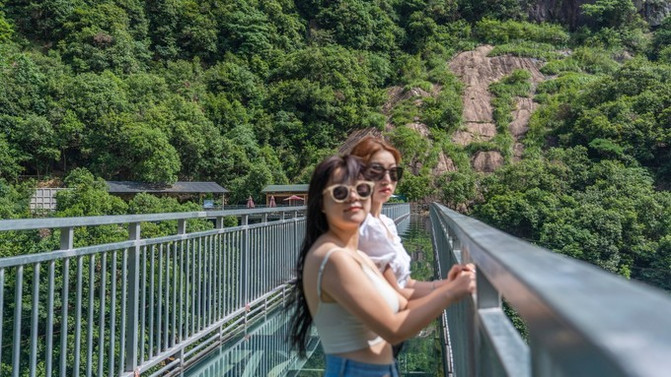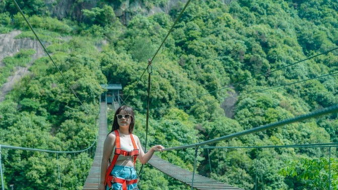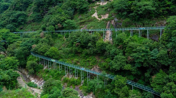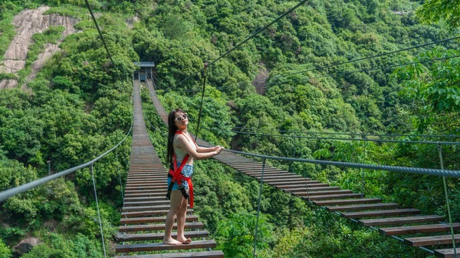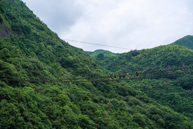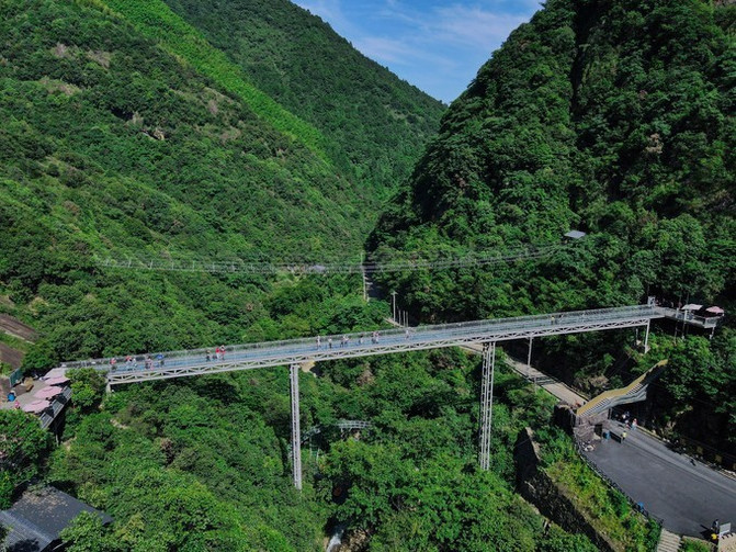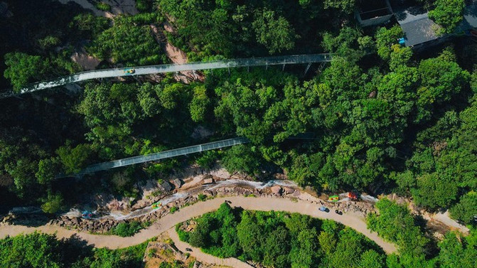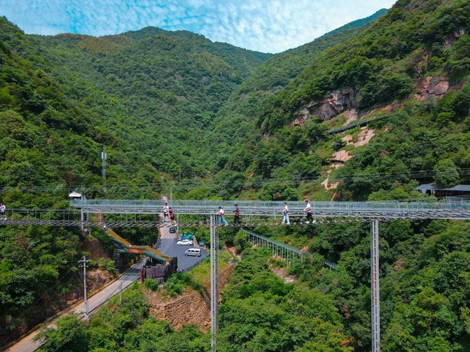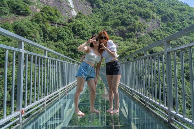 Cuando llegue al otro lado del valle, puede jugar al rafting de vidrio en línea. El paseo de vidrio tiene una longitud total de 1280 metros y una caída de 88 metros. Es el primer tobogan de agua de vidrio en Hangzhou.