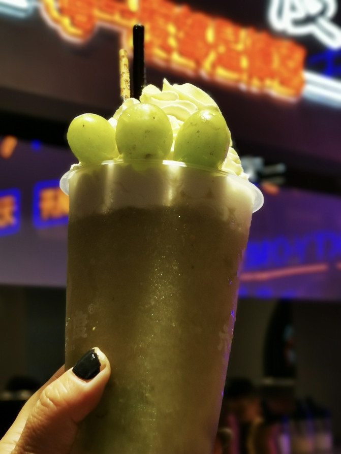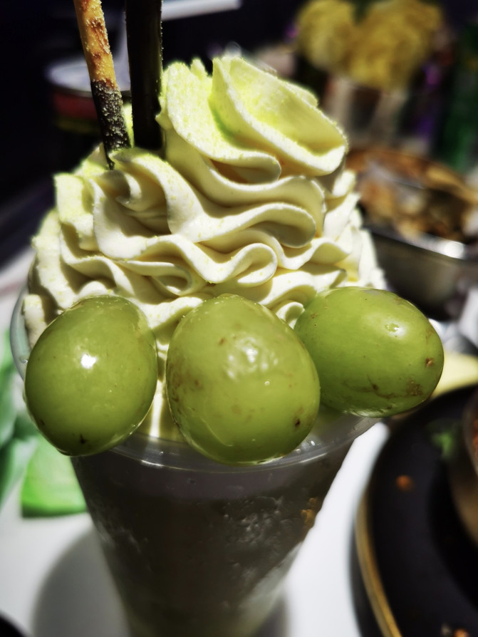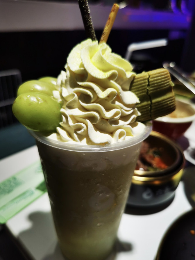 💎💕💙Burbujas de leche interminables adornadas con tres uvas, dos barras de chocolate y luego galletas verdes.