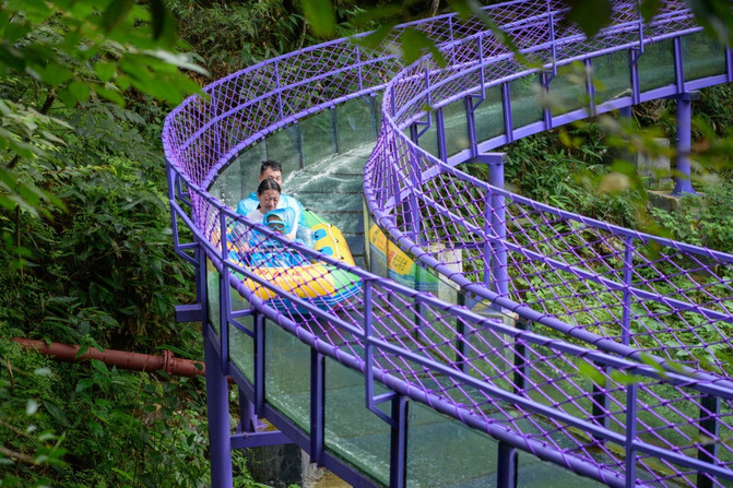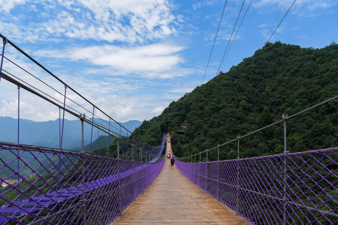 En este bosque montañoso, además del rafting de vidrio de gran altitud de Zilong Gorge, la plataforma de observación de vidrio de acantilado de flores de oro púrpura y el paisaje del cielo también son proyectos que deben golpear la tarjeta del cielo. Entre ellos, el mirador de acantilado de vidrio de Zijinhua es el mirador de vidrio de doble capa más grande del mundo, con más de 600 cuadrados, y el paisaje del cielo se encuentra en el tercer piso del mirador de acantilado de vidrio.