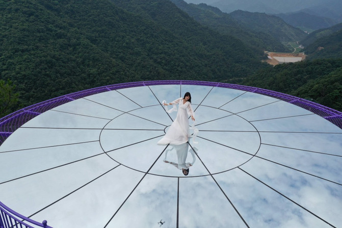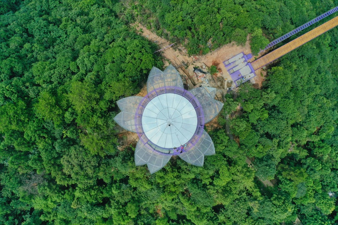 De pie en lo alto mirando hacia abajo, este mirador de vidrio es como una flor de oro púrpura que nunca se marchita. Ese sentimiento emocionante y romántico es muy adecuado para las parejas para perforar tarjetas juntas.