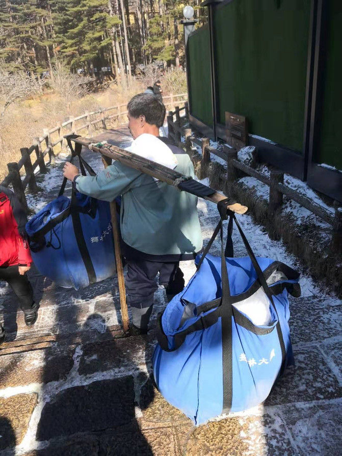 Los trabajadores de montaña de Huangshan, los bienes en la montaña de siete centavos por jin, dos viajes al día, un viaje de unos 200 jin, son algunos tíos de 50 años, y trabajan duro y no ganan dinero, parece que este tipo de trabajo es escaso.