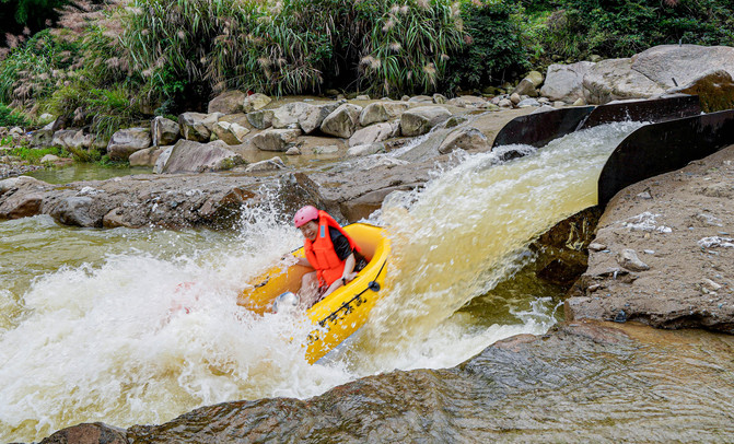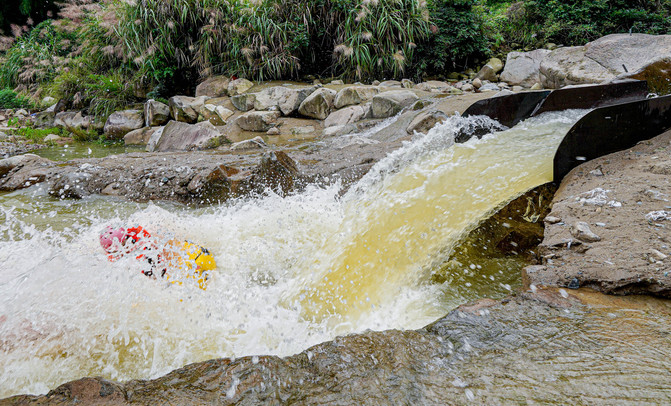 Algunas rampas son particularmente emocionantes, las personas con el kayak se precipitarán en el agua, toda la persona se mojará instantáneamente por el arroyo, emoción absoluta.