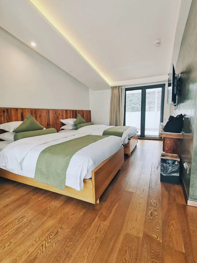 Instalaciones: Hay muchos tipos de habitaciones en Hidden Flower Dock, esta vez nos alojamos en una habitación doble de lujo con terraza, la cama era grande y dormir muy cómodamente, la característica más grande es dos balcones, un gran balcón con vistas a la montaña Mogan no muy lejos, los ojos llenos de verde son muy curativos.