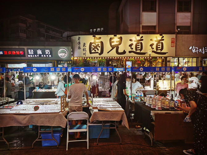 La cena originalmente tenía la intención de ir a la orilla del lago Yintai para comer, pasando por Longyou Road y Wulin Road, encontró este mercado nocturno de Wulin, los turistas como tejido, animado extraordinario, así que decidió buscar comida aquí.