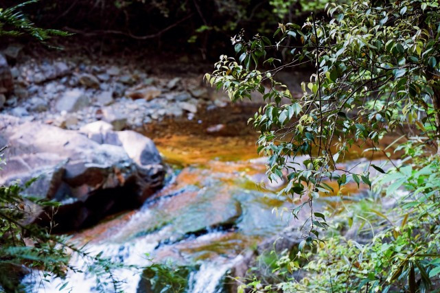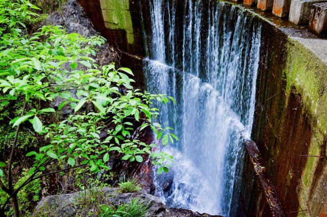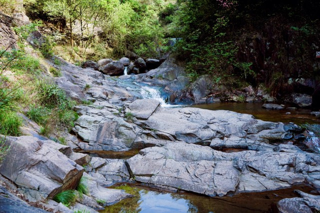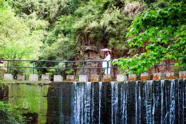 El arroyo en el Parque Forestal Nacional de Daqi Mountain consiste principalmente en agua de manantial y agua de lluvia. Las cascadas volantes cuelgan de la pared de la montaña, viendo el estado de ánimo relajado.