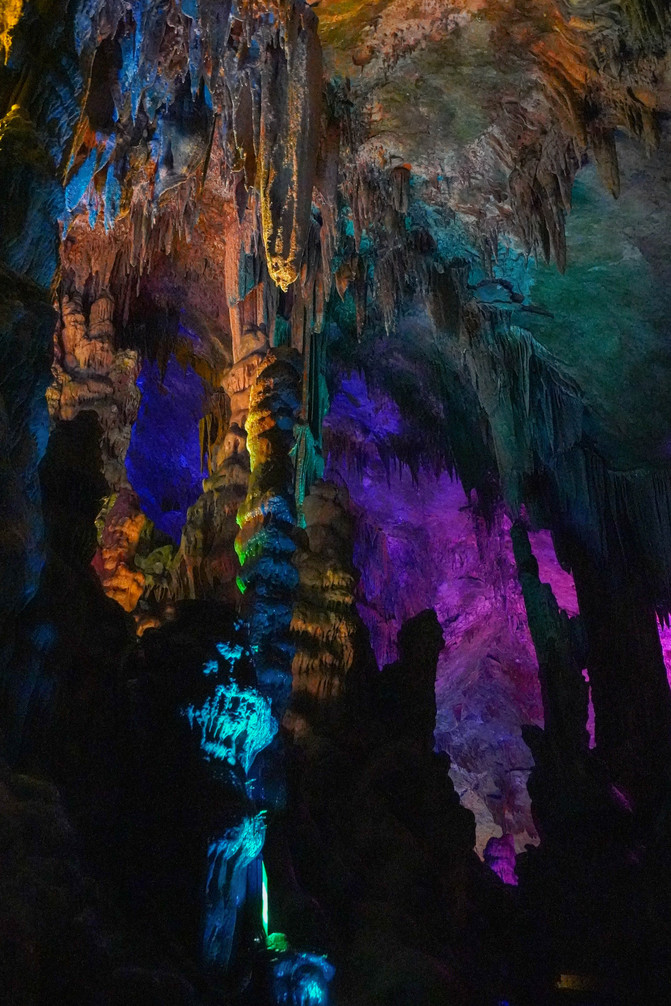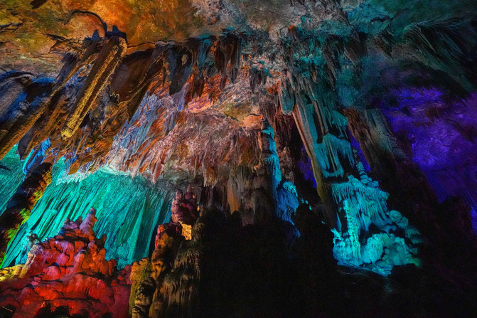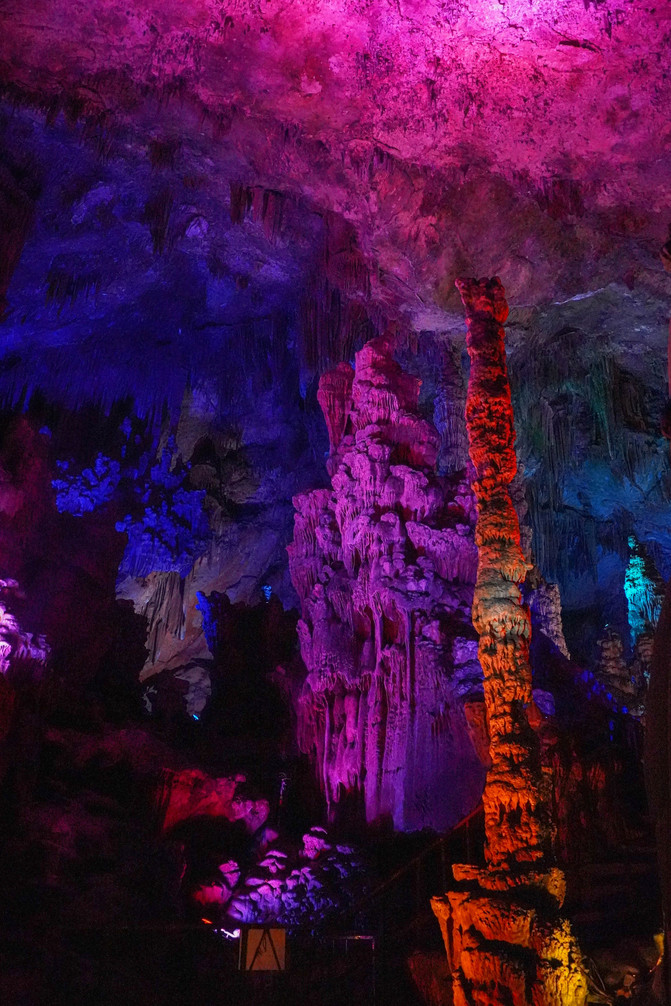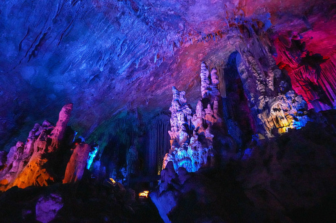 Yao Lin Wonderland es famoso por su terreno mágico y su magnífico paisaje de estalactita, que es particularmente hermoso contra el contraste de luces coloridas.