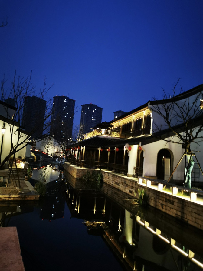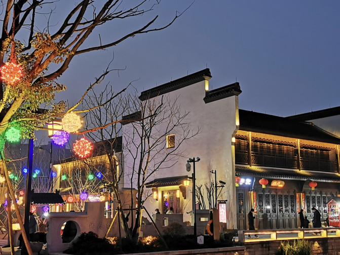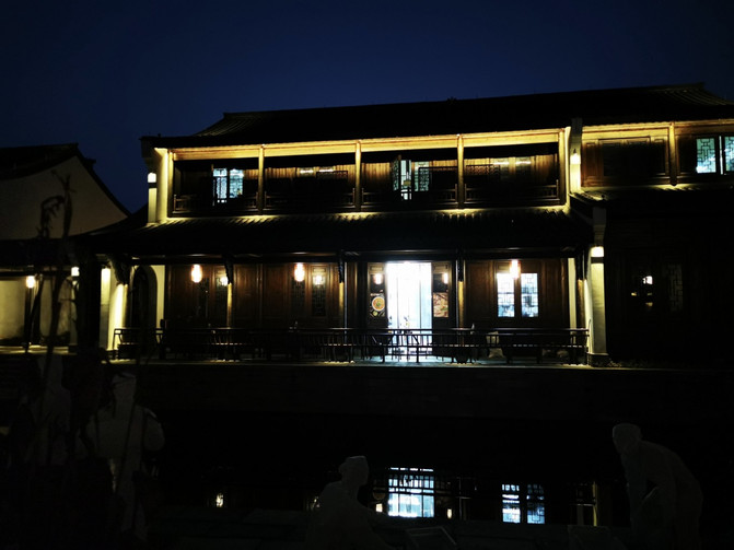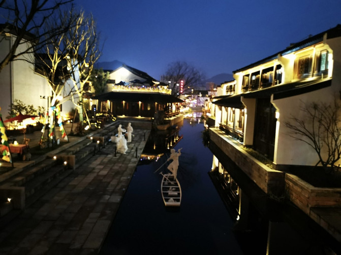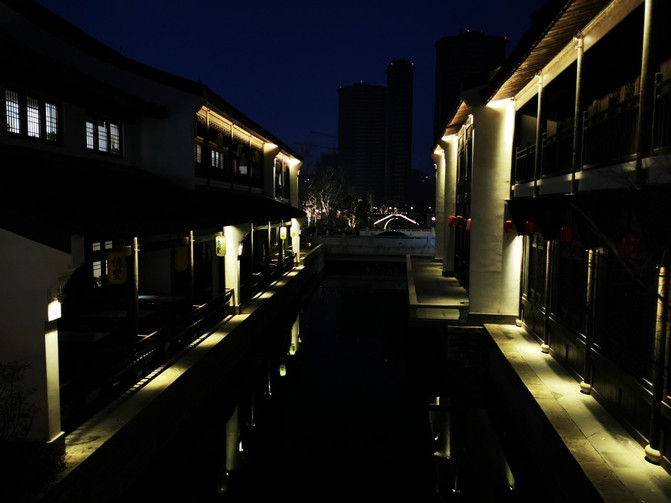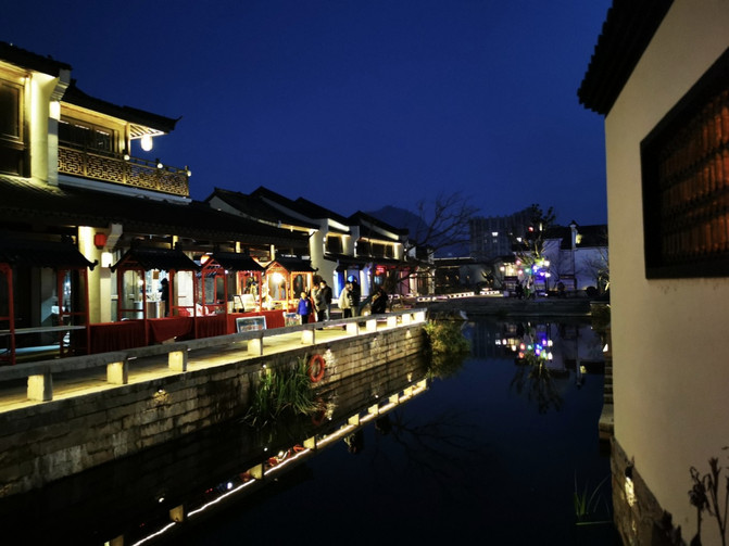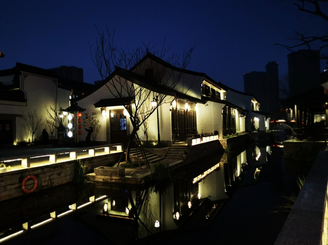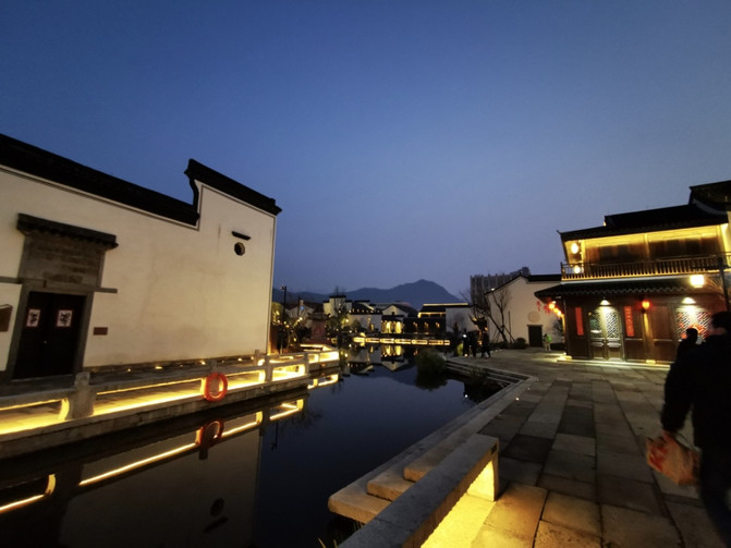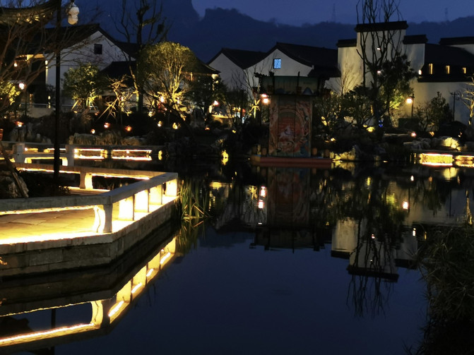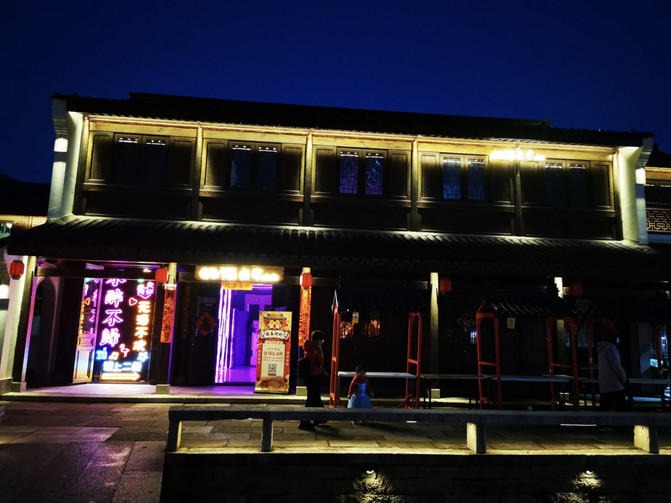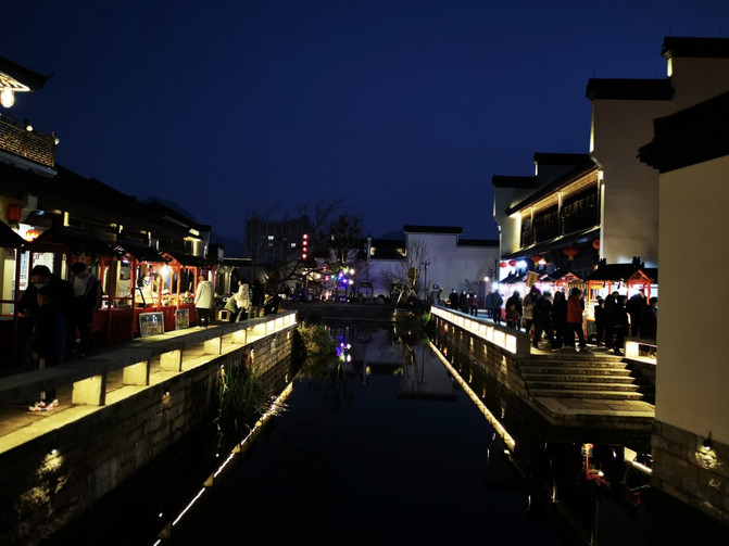 🌟🌟🌟 Bajo el efecto de las luces nocturnas, la vieja calle de Oolonglin logra un efecto brillante más perfecto. Bajo las orillas del río, los edificios tradicionales de madera de paredes blancas y azulejos grises se reflejan en el agua.