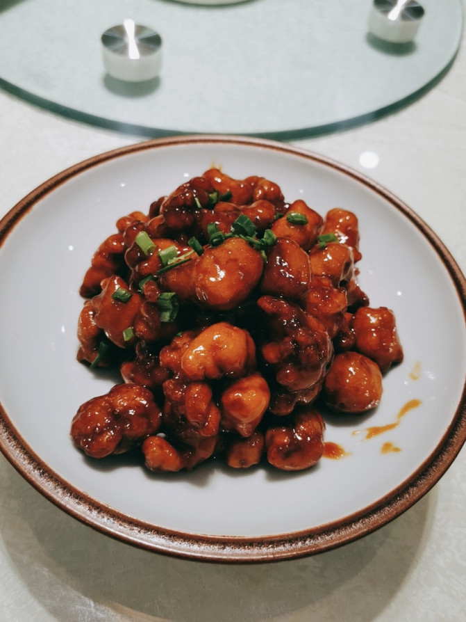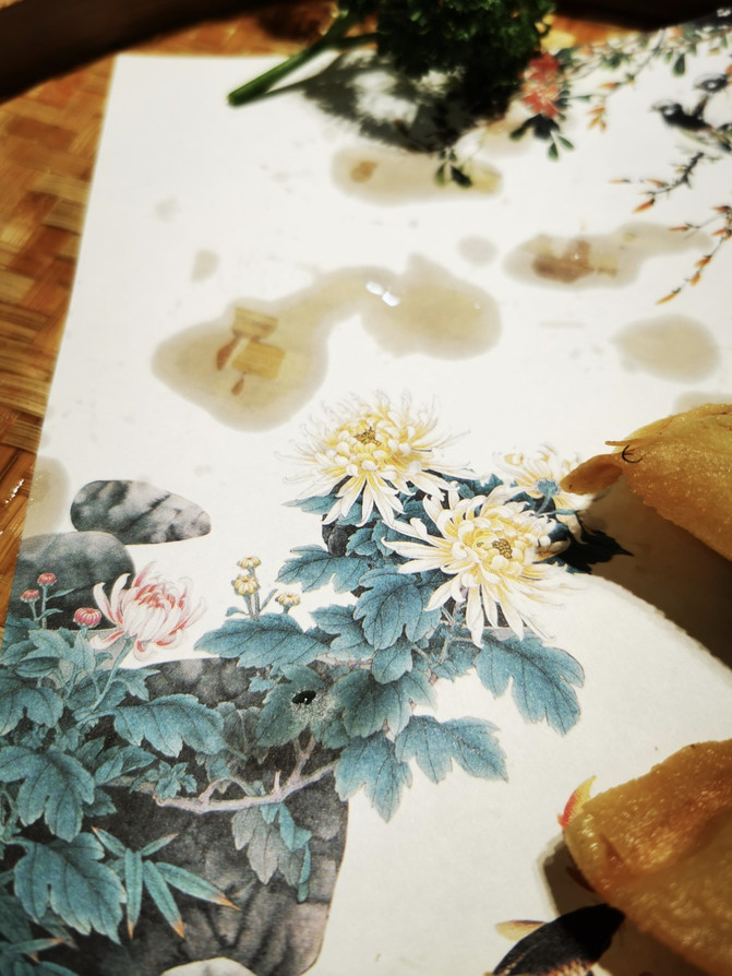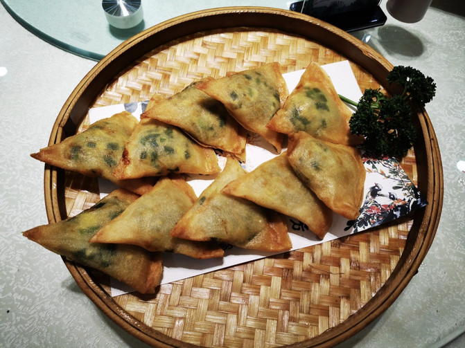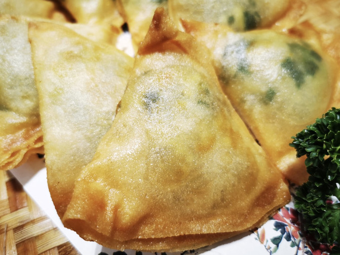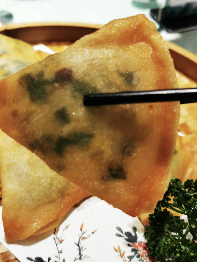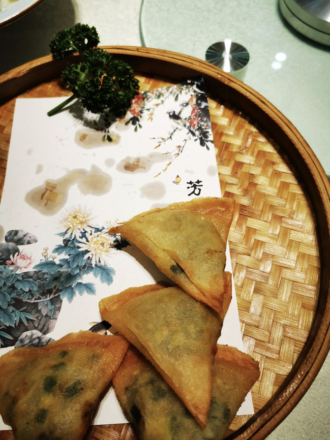 😍😍😍Mi favorito es este pastel frito, que se hace en este tipo de triángulo y se coloca en un pequeño plato redondo de bambú, junto con un papel de cojín exquisito impreso con crisantemo,