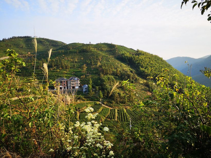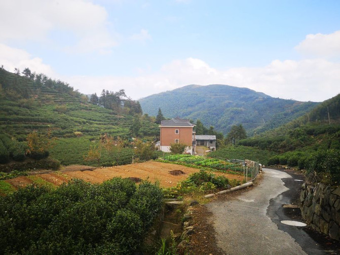 La aldea de montaña de su propia granja está rodeada de jardines de té en las montañas, las carreteras en las montañas son planas y serpentean en el patio delante y detrás de la casa, las flores y las hierbas plantadas, atraen a las mariposas a volar.