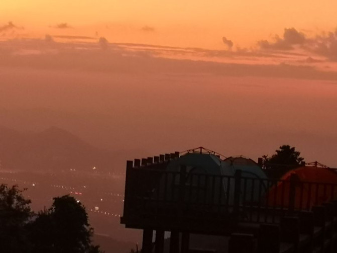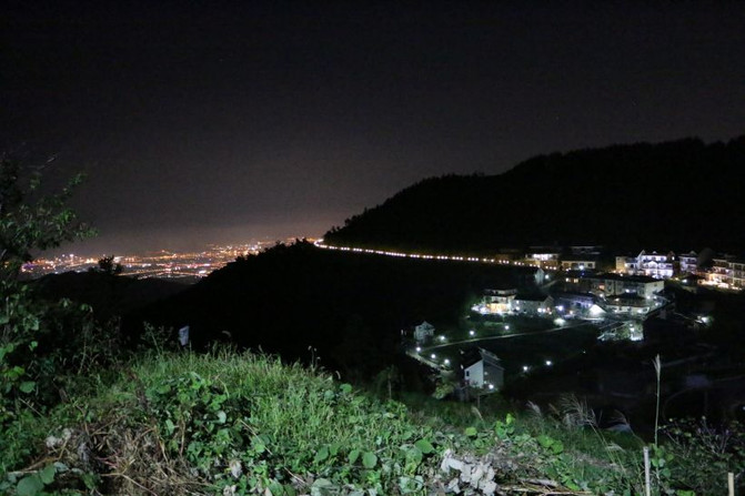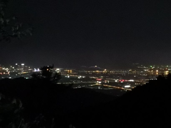 La deslumbrante vista nocturna de la ciudad al pie de la montaña en la noche, también hace que las personas anding montaña lejos del bullicio de la ciudad, un buen lugar para escapar del verano