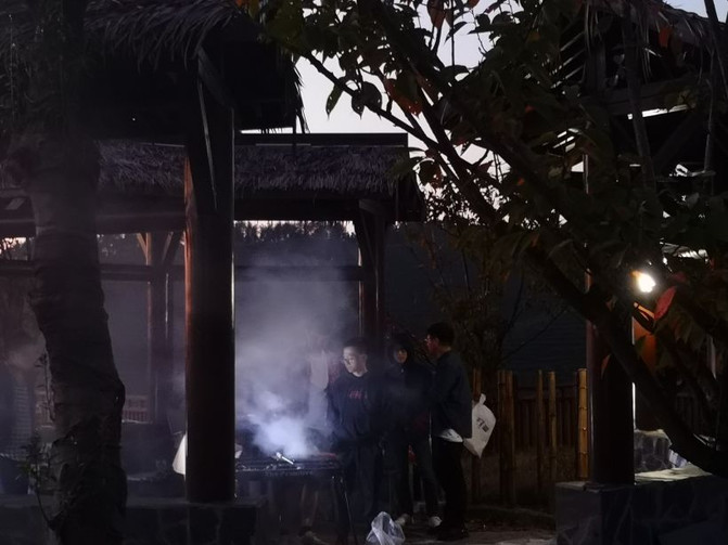 El área de la tienda de campamento y el área de barbacoa están bien divididos, con marcos de arco de madera construidos en el área de barbacoa.