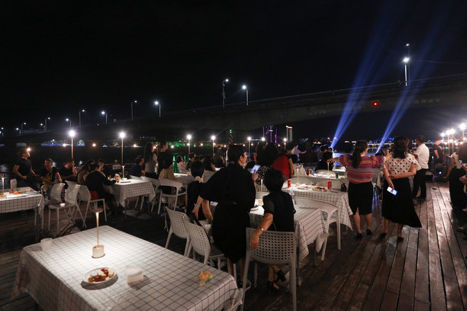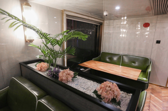 El crucero se divide en tres pisos superiores, medios e inferiores, el primer piso es el área de comidas de buffet, el segundo piso es el área de descanso, tranquila, el tercer piso es el área de comidas al aire libre y espectáculos de canto y baile, ruidosa.