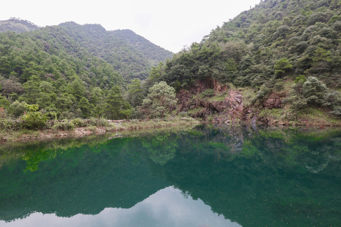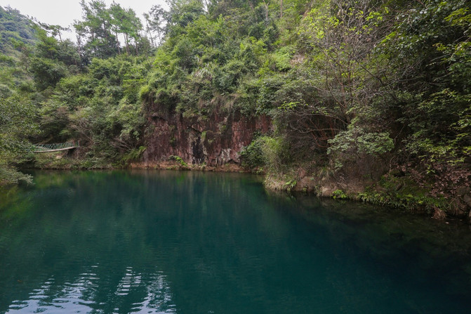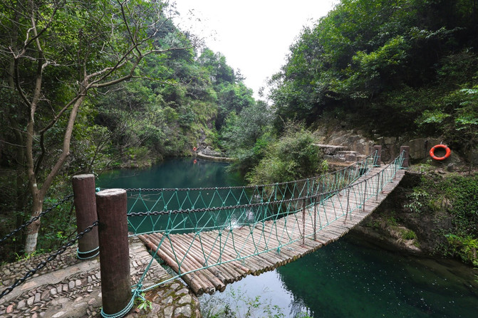El puente de piedra y el pavilión de piedra construidos en función de la tendencia de la montaña agregan la belleza de la montaña Daqi. Caminó a través del puente colgante y llegó a Tianchi en la cima de la montaña después de un período de flores oscuras. El agua del estanque aquí es clara, la superficie del agua es el reflejo de los árboles verdes, tiene un poco de sabor a Jiuzhaigou.