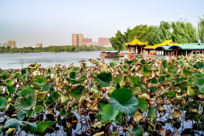 Hay una isla en el lago, Lixia Pavilion está en la isla, Lixia Pavilion es uno de los pabellones famosos de Jinan, debido a su borde al sur de la montaña Li (Qian Foshan), por lo que el nombre de Lixia Pavilion, también conocido como el pabellón antiguo. El antiguo pabellón de Haiyou se ha hecho famoso desde entonces, y la combinación de "Haiyou este pabellón antiguo, Jinan muchos famosos", se ha convertido en el orgullo de Jinan durante miles de años. El pabellón está completamente vacío, con barandillos de madera alrededor del pabellón, y taburetes de lótus tallados en piedra para que los visitantes puedan descansar. Bajo el segundo piso del pabellón, colga una placa dorada con el fondo rojo del pabellón bajo el calendario del emperador Qianlong. Toda la isla está rodeada de sauces verdes, flores y árboles escasos, pabellones y galerías dispersados, bambú y flores fragancias adornan entre ellos. En la primavera, el bambú se cultiva y el sauce verde fuma; en el otoño, el agua del lago ondula, el loto fragante, la brisa fresca sopla lentamente, es refrescante, se llama "viento de otoño", una de las ocho vistas de la antigua ciudad.