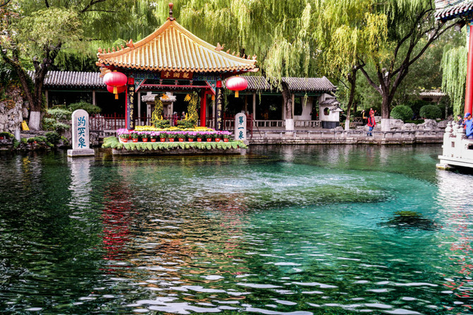 Mirando hacia el centro de la piscina, se pueden ver vagamente tres orificios de manantial, y tomando esto como el centro, el agua de manantial se balancea lentamente alrededor de ondulaciones. Las ondas de agua surgidas alarman a los peces curiosos, que persiguen jugando junto al ojo del manantial, rompiendo las sombras profundas y superficiales de los árboles, más ágiles y encantadores. Desafortunadamente, no se encontró con la leyenda de la "fuente de agua" buen momento, aunque la tranquila Fuente de agua también tiene una belleza tranquila y tierna, los años son tranquilos, pero el Sr. Lao She escribió el agua de primavera "hervir" como un magnífico paisaje, todavía sólo puede vivir en un sueño.