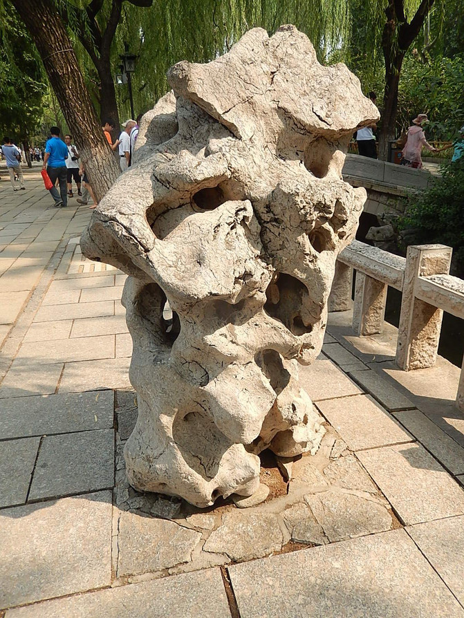 Esta piedra del lago taihu en el patio se llama "esperar el pico del sol", originalmente coleccionada por Zhang Yanghao, en el cuerpo de piedra de aproximadamente 1,5 metros de altura, está cubierto de la formación de luna llena o varios agujeros en forma de menisco, cada vez que la luna brillante cuelga en la noche, la forma de piedra y los agujeros en la luz de la luna, se reflejan en el agua del estanque de piedra, más transparente, hermoso.