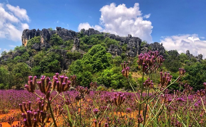 Las piedras extrañas del bosque de piedras de Naigu y el bosque de piedras son diferentes, son negras, se ven muy imponentes, también se llama "bosque de piedras negras". A través del bosque de rocas, a los lugares escénicos del distrito oriental, se puede ver el panorama general del bosque de rocas antiguo y el paisaje rural circundante, así como el hermoso mar de flores, vale la pena echar un vistazo.