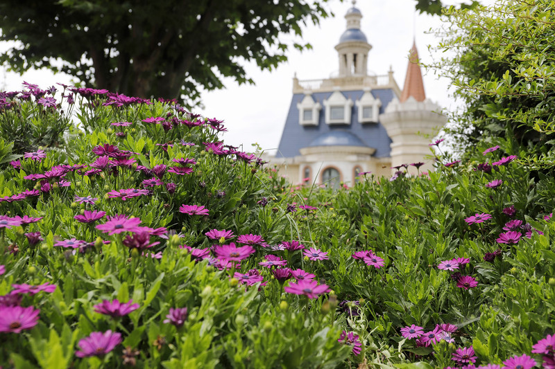 Entrando en la puerta de Fenglong Bay Fairytale Town, se ve un gran mar de flores de castillo. En abril, es la época de floración de las rosas y las wisteria. Las rosas y las rosas cuelgan en las ramas, y hay hilos de romance púrpura que cuelgan en las ramas, fragancia desbordante, agarrando la cola floreciente de la primavera.