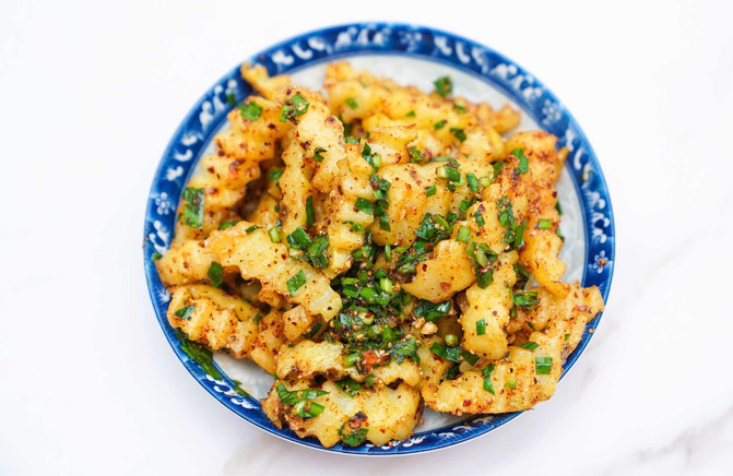 Las papas frías se sirven en un tazón o tazón, luego se agregan con sal, aceite de sésamo, vinagre, ajo molido, pimienta y otros condimentos y se mezclan bien, y se pueden comer.